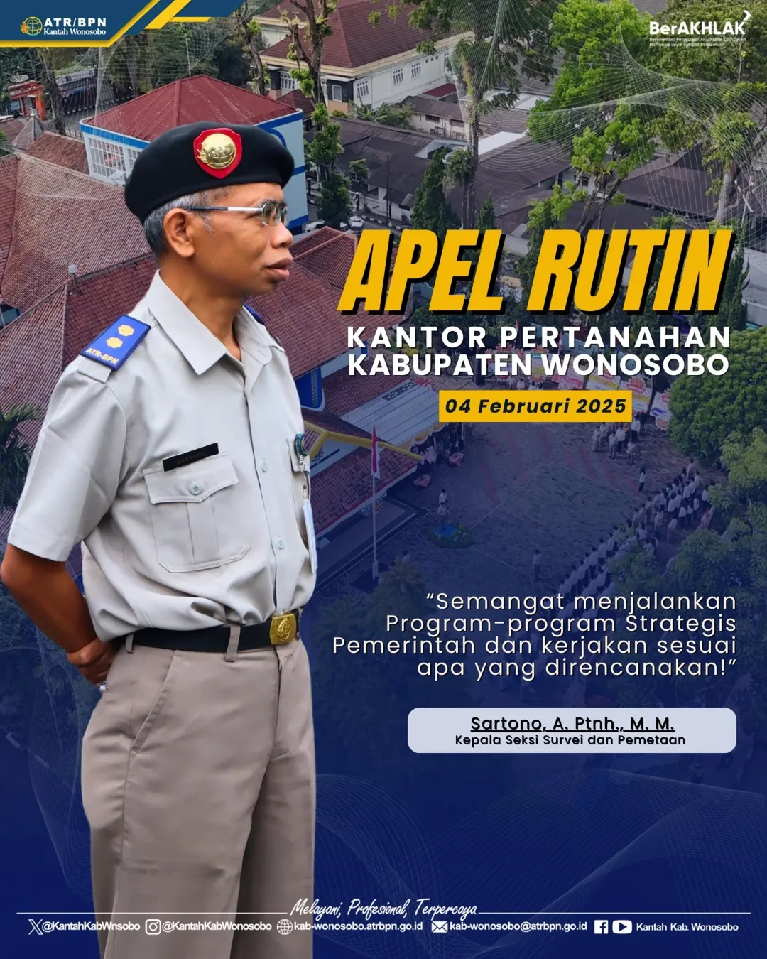 Hari ini (04/02) Kantor Pertanahan Kabupaten Wonosobo melaksanakan Apel Pagi Rutin yang dipimpin oleh Kepala Seksi Survei dan Pemetaan, Bapak Sartono, A.Ptnh, M.M. yang diikuti oleh seluruh pegawai... Selengkapnya